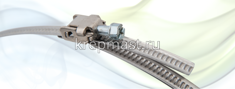 Зажим для ленточного металлического хомута изготовлен из оцинкованной стали предназначен для соединения ленточного хомута. Применяется в заворачивании винта, при этом, максимальный момент затяжки ленточного хомута не должен превышать 5.5 Н.м Ленточные хомуты изготавливаются из оцинкованной стали. В зависимости от диаметра фиксируемого патрубка (от 8 до 300 мм) лента шириной 9 мм.