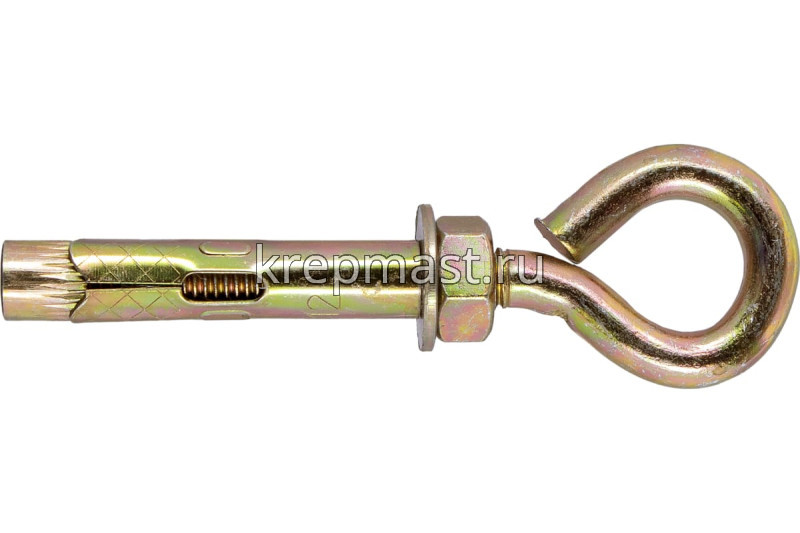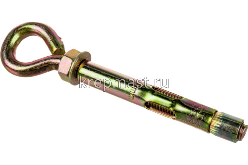 Анкерный болт с кольцом 10 х 80 является элементом крепежа для фиксации тяжелых подвесных конструкций, соединения с тросами и цепями.