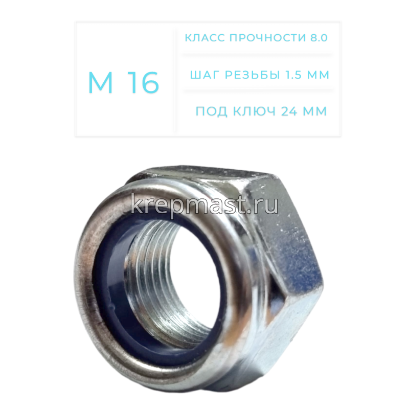 Cамоконтрящая гайка М 16 DIN 985/ГОСТ 50273 с мелким шагом резьбы 1,5 мм используется для создания разборного соединения совместно с болтом или винтом.