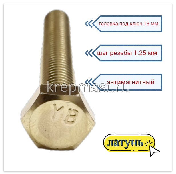 Латунный болт DIN 933 М8 х 50используется в случае, когда необходимо создать немагнитный узел. Латунный болт М8 применяется в приборостроении, авиации, атомной промышленности. Латунный крепеж стоек к органическим кислотам и углекислым растворам.