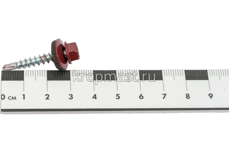 Кровельный саморез окрашенный с шайбой и резиновой прокладкой EPDM DIN 7504 4,8 х 29 по дереву RAL 3005 (цвет винно-красный) - представляет из себя саморез с шестигранной головкой, фланцем и резиновой прокладкой для эффективного прижатия листового металла к основанию.