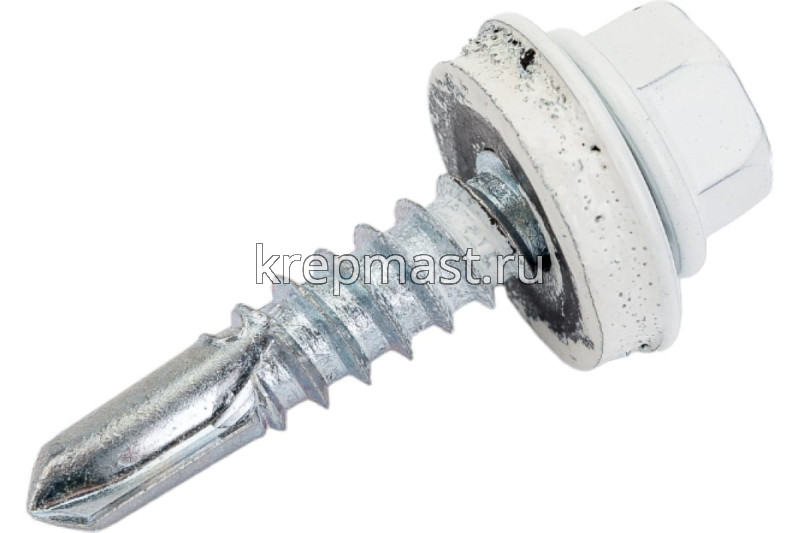 Кровельный саморез окрашенный с шайбой и резиновой прокладкой EPDM DIN 7504 5,5 х 25 по металлу RAL 9003 (цвет белый) - представляет из себя саморез с шестигранной головкой, фланцем и резиновой прокладкой для эффективного прижатия листового металла к основанию.