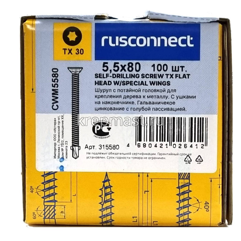Саморез кровельный ТХ30 с ушками без шайбы DIN 7504 P 5,5х80 потай. - сверло оцинк. Rusconnect применяется для крепления деревянной доски к металлической обрешетке. На острие самореза находится бур с двумя выступающими "ушками", которые свободно проходят через древесину и обламываются, когда саморез достигает металла. На нижней стороне потайной головки есть несколько выступов предназначенных для самозенковки и аккуратного утапливания заподлицо с поверхностью. Помимо досок данными саморезами можно крепить фанеру, ДСП и плиты МДФ.