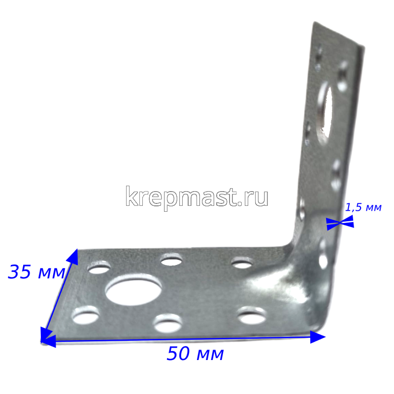 Крепежный усиленный уголок КР 5 50х50х35х1,5 предназначен для крепления деревянных конструкций (при монтаже каркасов стропильных систем). Уголок кп5 изготовлен из оцинкованной стали толщиной 1,5 мм. Усиленный уголок кр5 имеет дополнительное ребро жесткости для усиления его несущей способности.