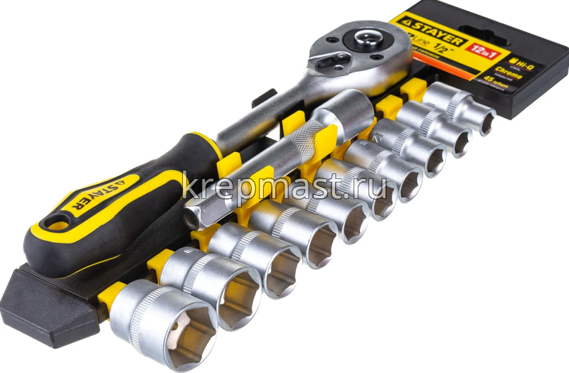 Набор STAYER головок торцевых 1/2" (10-24мм) 12 предметов используется при проведении ремонтных и монтажных работ в автомастерской. Он содержит торцовые головки размером от 10 до 24 мм, трещотку с 45 зубцами и удлинитель. Головки выполнены из закаленной инструментальной стали, обладающей высокой прочностью и твердостью. Благодаря хромированному покрытию инструменты надежно защищены от коррозии.