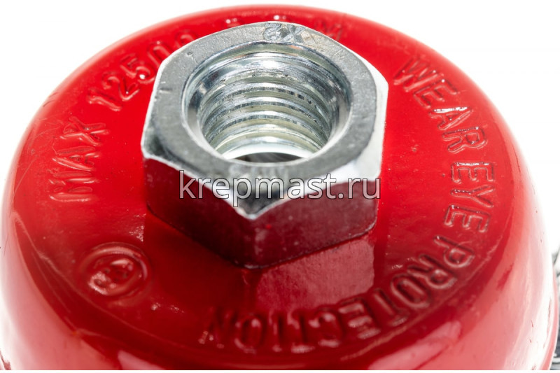 Корщетка-чашка 75 мм используется для шлифовальных и обдирочных работ в угловых шлифовальных машинах. Оснастка крепится к инструменту при помощи гайки М14. Рабочая поверхность щетки — витая стальная проволока.