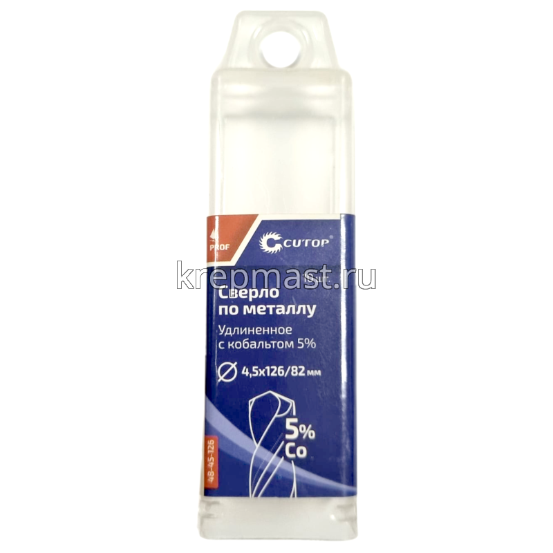 Удлиненное кобальтовое сверло по металлу М 4.5 x 126мм CUTOP изготовлено из быстрорежущей стали Р6Co5М5. Сверло шлифованное и имеет цилиндрический хвостовик. Подходит для сверления цветных металлов. Угол заточки при вершине — 135 градусов, а класс точности — А1.